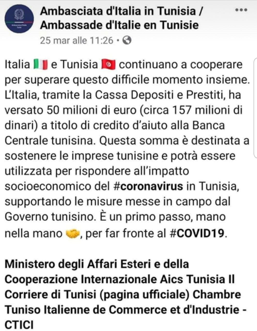 ROMA, 27 mar – “Nei giorni scorsi la pagina Facebook dell’Ambasciata d’Italia in Tunisia annunciava che la cooperazione tra Italia e Tunisia continuava anche in un momento difficile e che lo stato Italiano, tramite la Cassa Depositi e Prestiti, aveva versato 50 Milioni di Euro alla Banca Centrale Tunisina. La somma, così come scritto nel post, sarà destinata al sostegno delle imprese tunisine per rispondere all’impatto socioeconomico a causa del Coronavirus. Il post, pubblicato sulla pagina dell’Ambasciata Italiana a Tunisi, in data 25 Marzo, era presente fino a questa mattina, quando verso le 10 è sparito. Forse per la vergogna?”.