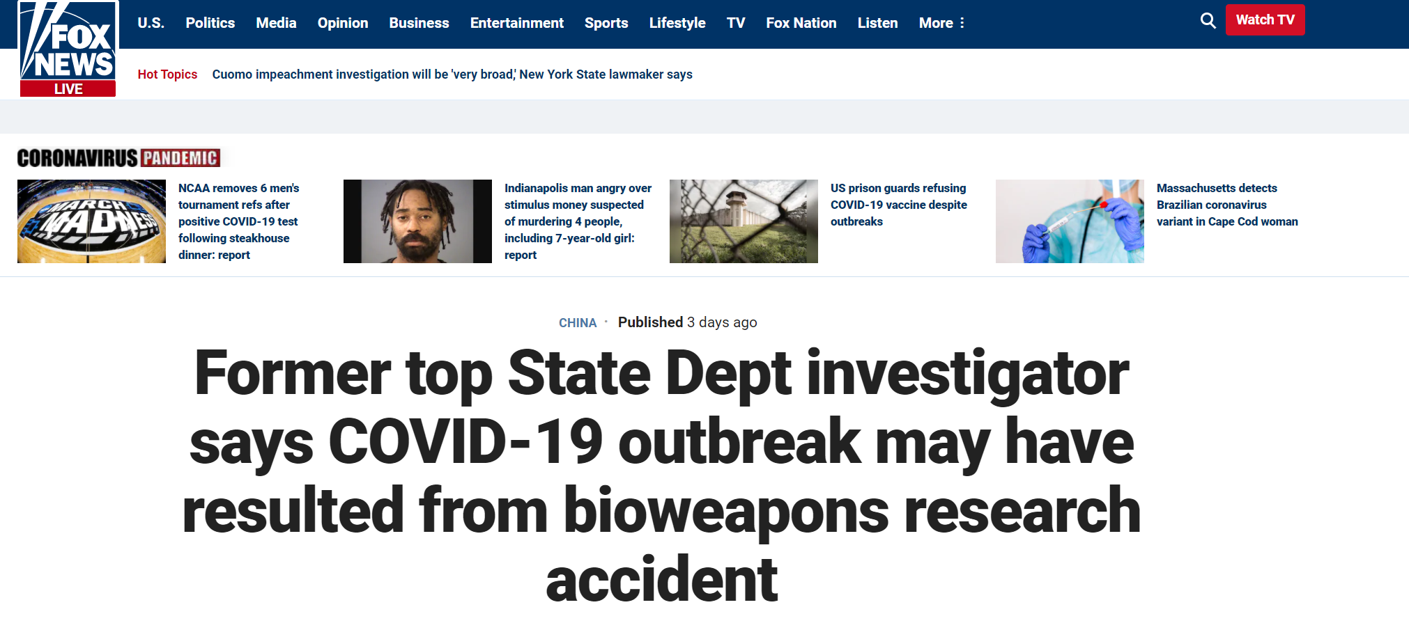Ieri abbiamo ripreso un interessante articolo di FOX NEWS in cui venivano esposte le tesi sulla diffusione del Covid-19 sviluppate da David Ascher, già investigatore capo del Dipartimento di Stato U.S.A. Ascher ha spiegato, forte della sua esperienza in materia che è sua opinione che il Coronavirus che ha causato la pandemia potrebbe essere sfuggito da una ricerca militare nel laboratorio di Wuham nell’ambito di un programma di armi biologiche. Tesi ampiamente argomentata come è possibile constatare leggendo l’articolo originale qui. Ma ecco la nostra traduzione di quanto sostenuto da Ascher.