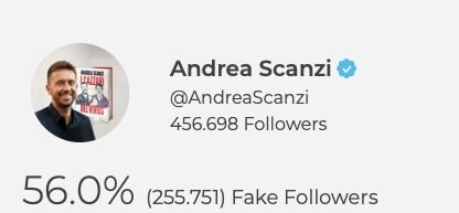 Sorpresa! Se si prova a usare lo stesso tool (Spark Toro) analizzando il profilo della super star filo-grillina, si scopre qualcosa di clamoroso: il grande accusatore ha più “fake” della Meloni su Twitter. Precisamente 56% Scanzi “contro” il 52,2 del leader di FDI.