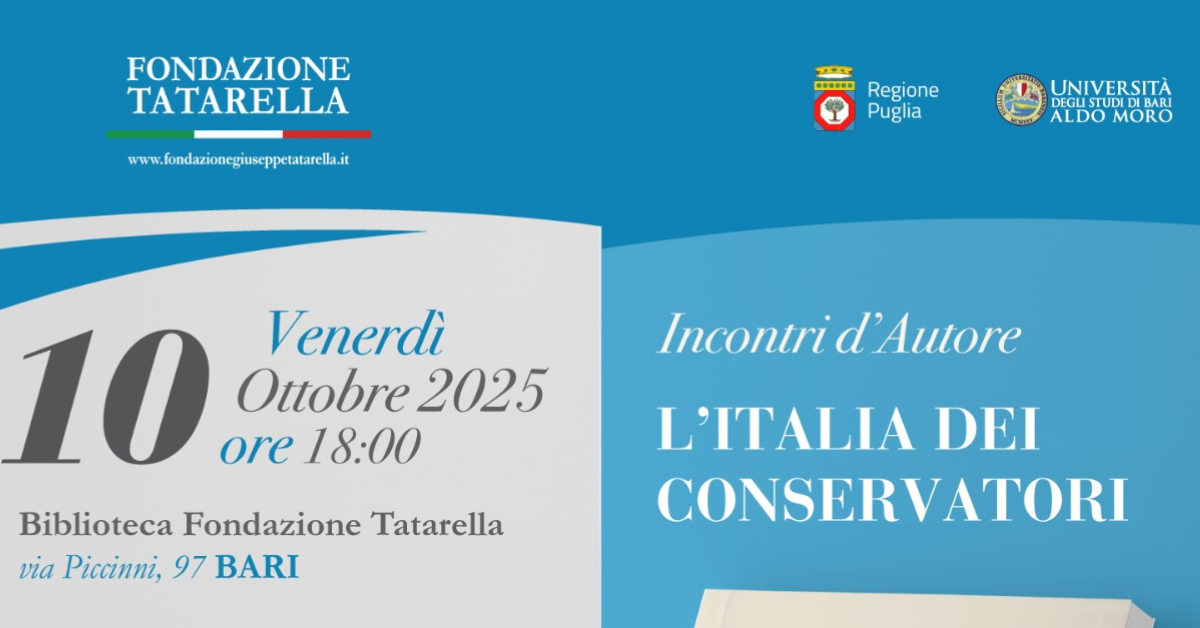 Per la rassegna Incontri d’Autore, la Fondazione Tatarella, venerdì 10 ottobre 2025 alle ore 18.00 nella Biblioteca della Fondazione (Bari, Via Piccinni n.97), presenta il libro “L’Italia dei Conservatori. Storia del conservatorismo italiano dall’antica Roma al governo Meloni” (Giubilei Regnani) di Francesco Giubilei, Presidente della Fondazione Tatarella e Direttore Scientifico della Fondazione An.