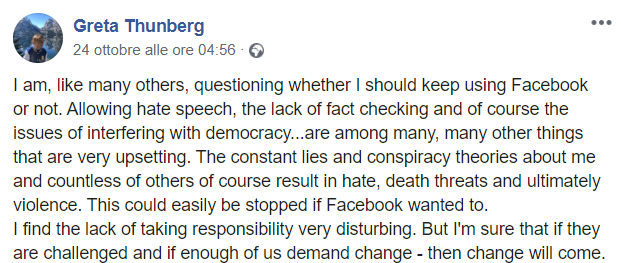 L’icona del clima ha invitato i suoi fan a “sfidare” Facebook a mettere a tacere i suoi antagonisti, insistendo sul fatto che “se abbastanza di noi chiedono il cambiamento, allora il cambiamento arriverà”.