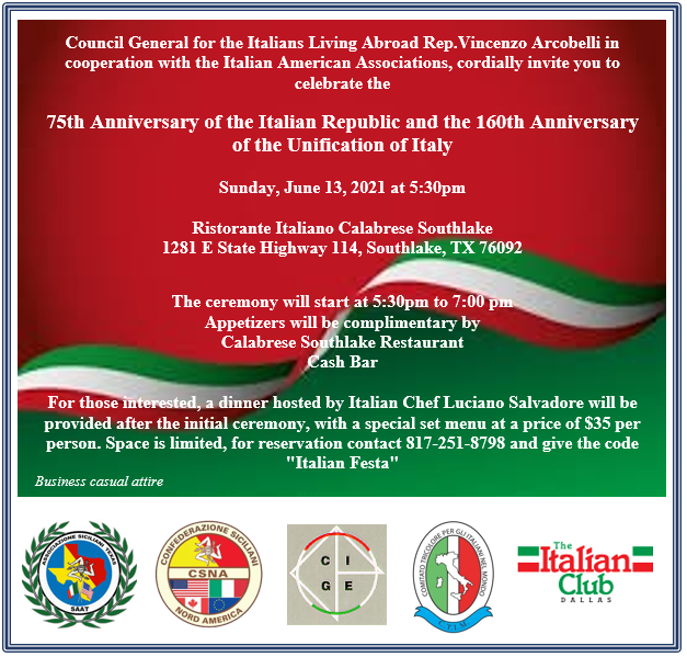 Domenica 13 Giugno la Comunità Italiana ed Italo-Americana si e’ riunita nell’area metropolitana di Dallas/Ft Worth in Texas (dopo 18 mesi dall’ultimo evento avvenuto di presenza, causa Covid)a seguito dell’iniziativa del Rappresentante del Cgie Vincenzo Arcobelli che in cooperazione con le Associazioni che operano sul territorio Texano, la CSNA, il CTIM, l’Italian Club di Dallas e la SAAT, per celebrare due anniversari di alto significato, il 75mo Anniversario dalla nascita della Repubblica Italiana ed il 160 mo anniversario dell’Unità d’Italia.