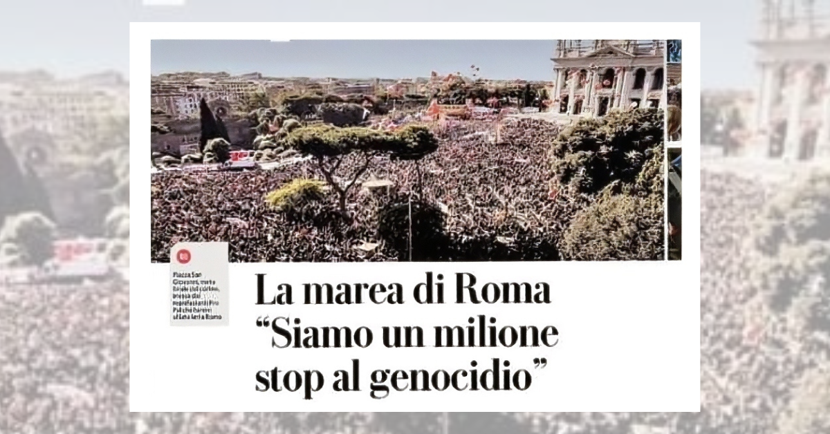Non era la “marea umana” pro-Palestina descritta da la Repubblica, ma una vecchia piazza della CGIL. La foto a tutta pagina pubblicata dal quotidiano per illustrare la manifestazione romana “Siamo un milione stop al genocidio” è stata smascherata dal suo stesso autore, il fotogiornalista Francesco Fotia.