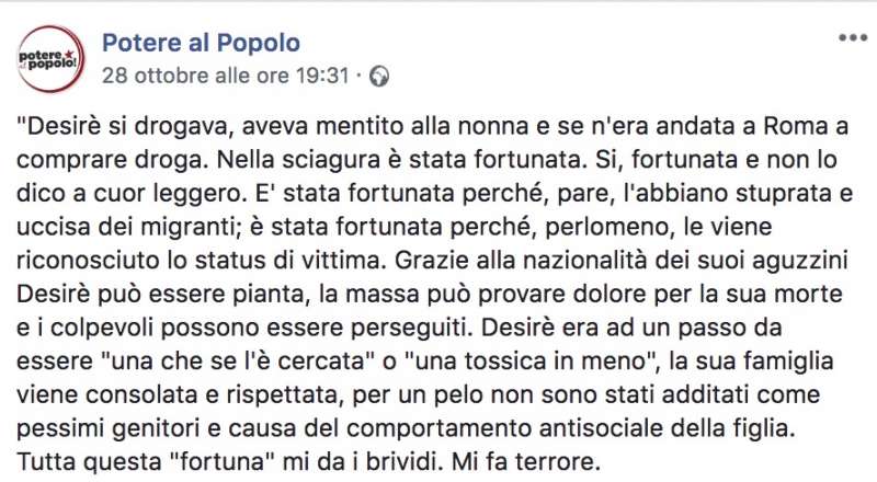 Una morte più digeribile politicamente, che vorrebbe mettere al riparo dalla nostra rabbia un manipolo di delinquenti fortemente voluti da una politica di accoglienza selvaggia che risponde solo ed esclusivamente a ragioni di profitto e abbandona al loro destino i più deboli, le periferie, dove agiscono incontrastati delinquenti e spacciatori, all’occorrenza stupratori si, ma quasi costretti ad esserlo se, loro malgrado, si trovano a dover cedere ai loro istinti più barbari di fronte ad una giovane “tossica”.