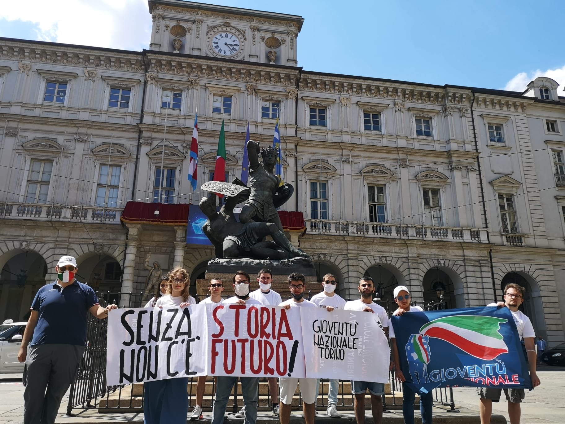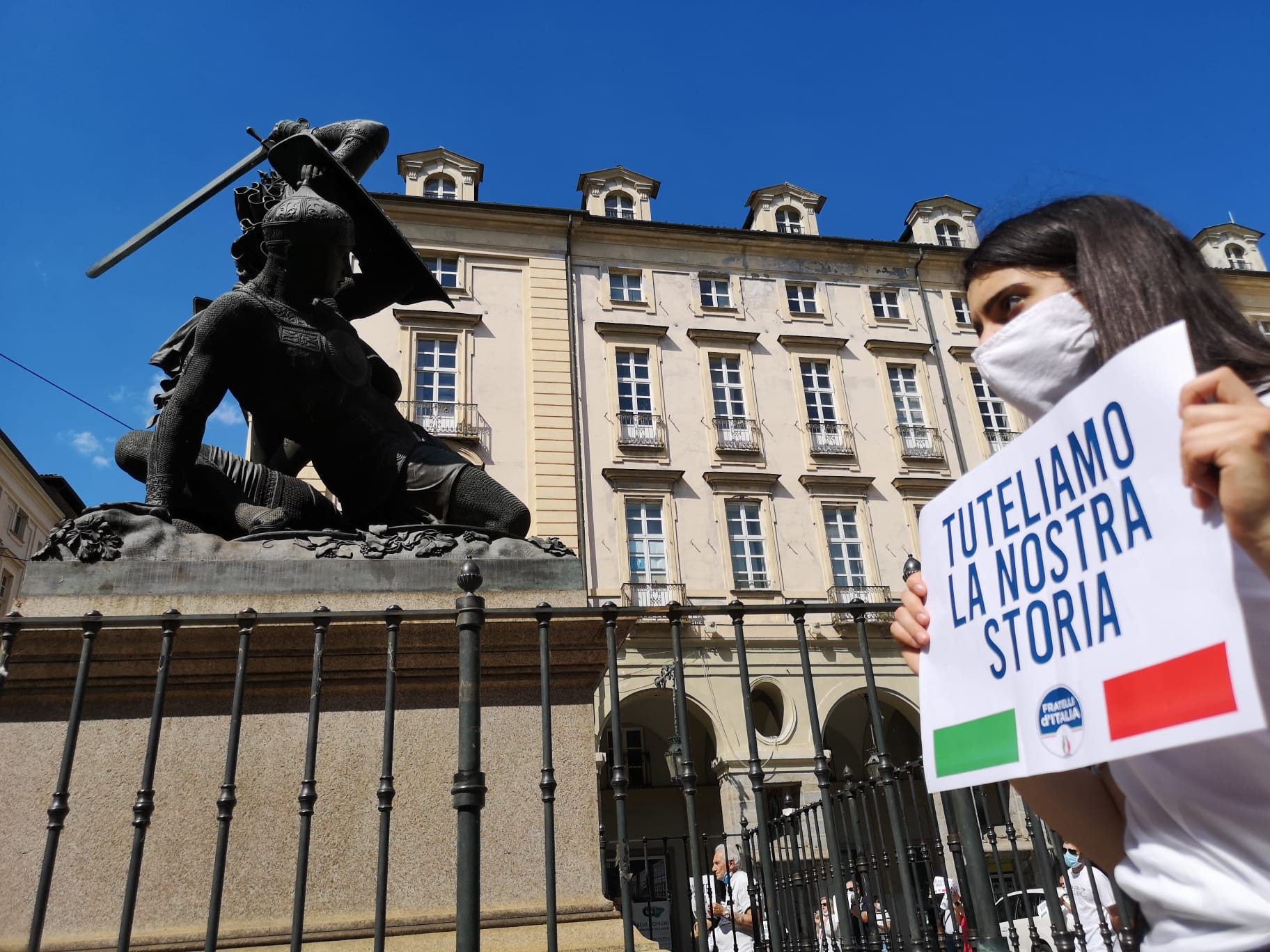 “No all’iconoclastia del politicamente corretto” è il messaggio che hanno lanciato nella giornata di oggi i militanti di Gioventù Nazionale Torino, movimento giovanile di Fratelli d’Italia, davanti al Monumento al Conte Verde in Piazza Palazzo di Città, a Torino.