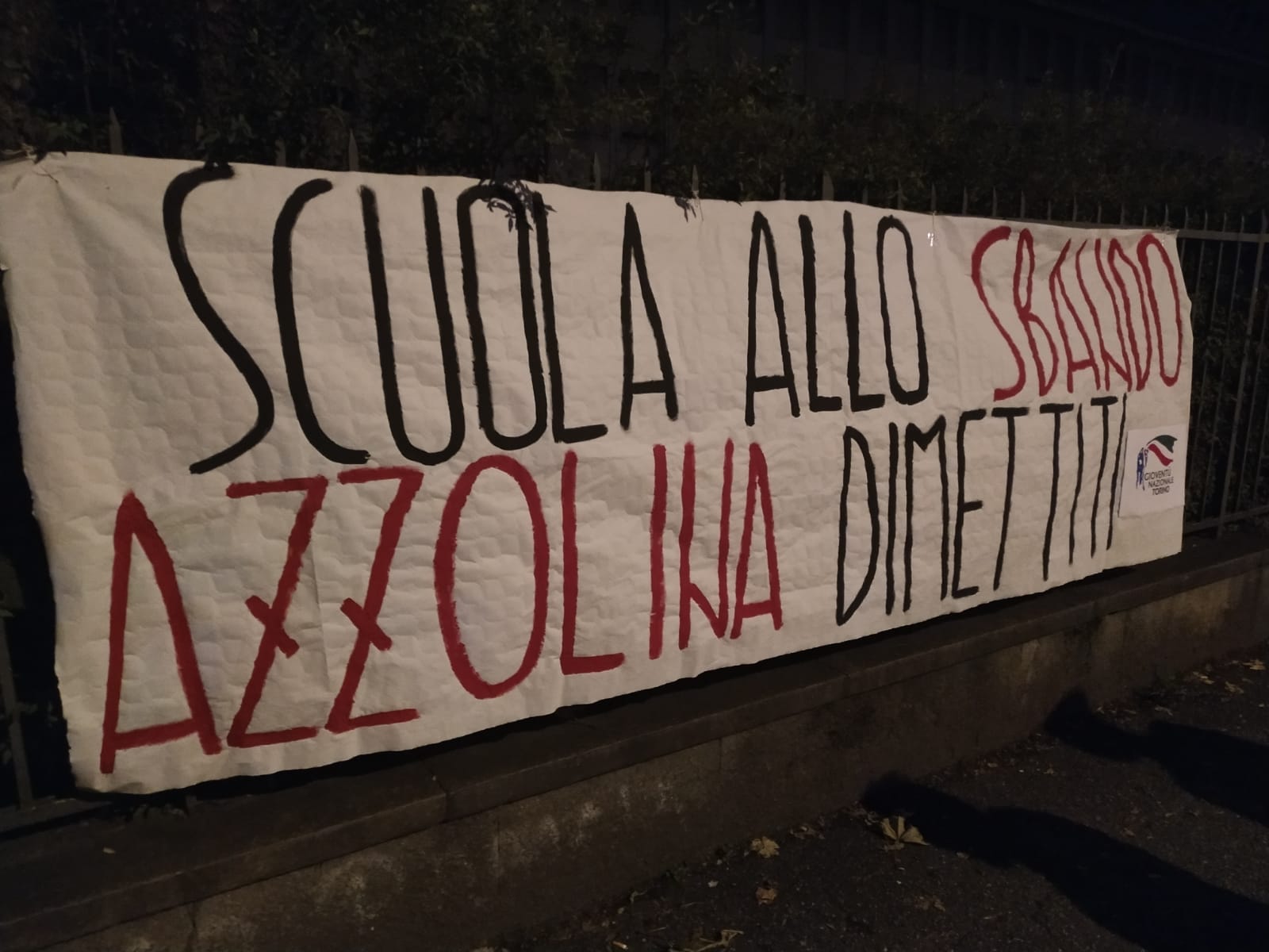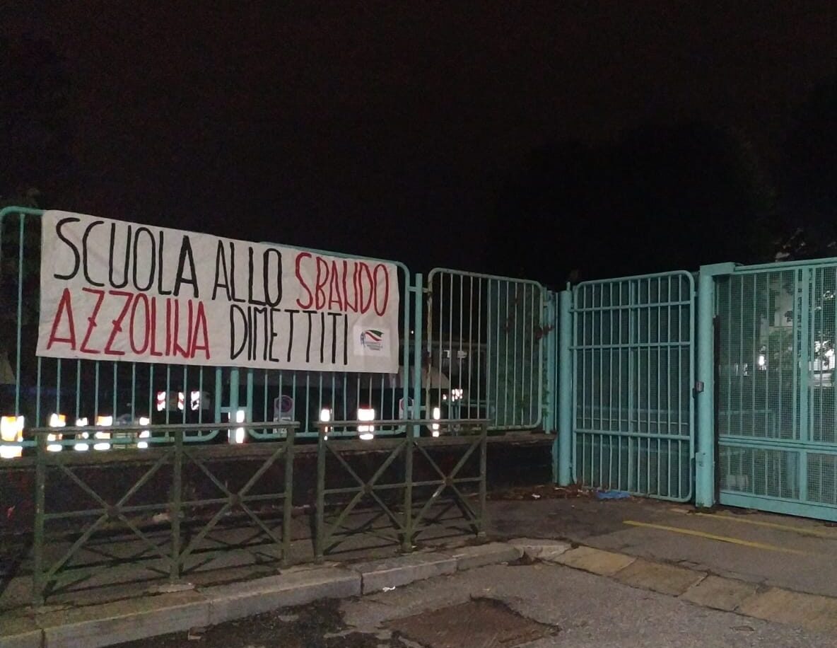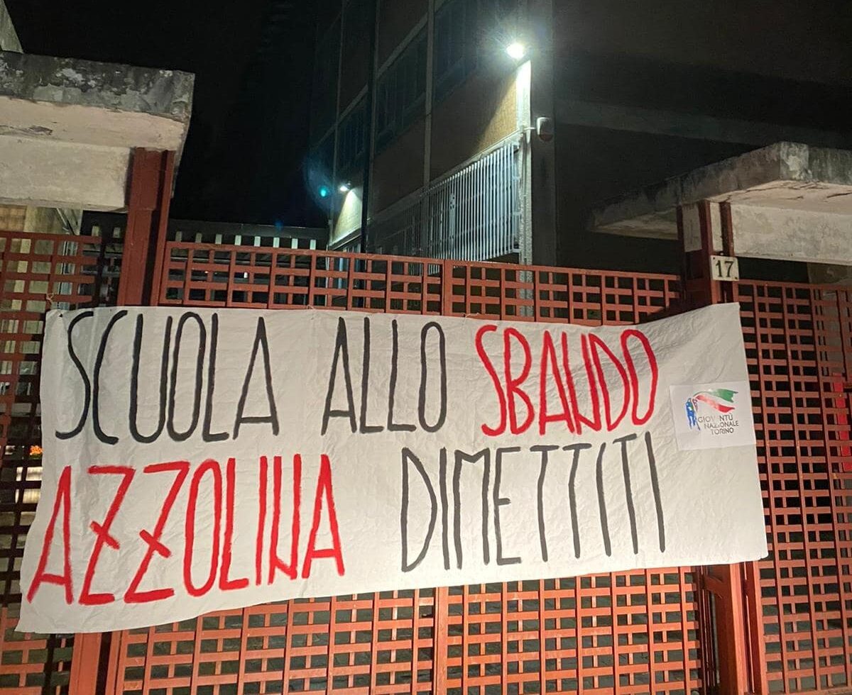 “Scuola allo sbando. Azzolina dimettiti”. È ciò che si legge nei diversi striscioni affissi nella “notte prima degli esami” di maturità dai militanti di Gioventù Nazionale, movimento giovanile di Fratelli d’Italia, a Torino ed in tutta la provincia.