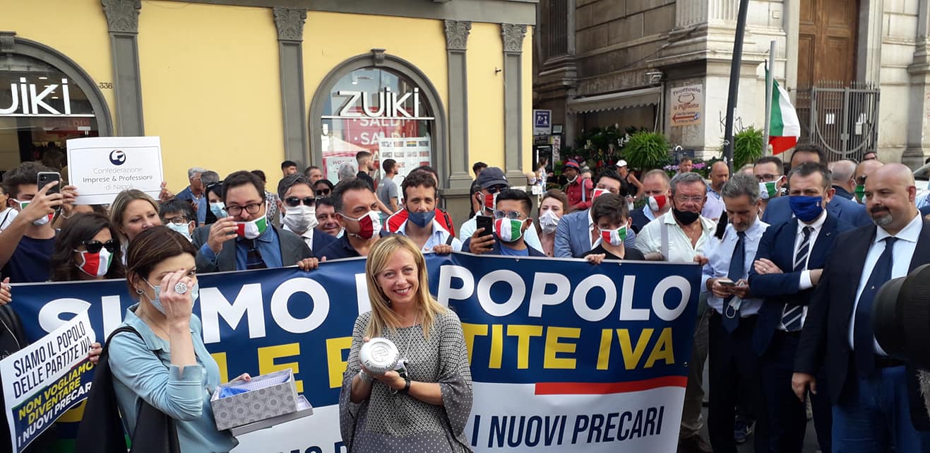 “Andando avanti con le ore ci si rende conto di quanto la grancassa del mainstream abbia esagerato. Stamattina leggo il commissario Gentiloni dire che le prime risorse non arriveranno prima della meta’ del 2021, cioe’ almeno 6 mesi dopo l’inizio delle nuove tasse europee sulle nostre imprese. Penso a quelle sulla plastica, che faranno aumentare ragionevolmente i prezzi di molti prodotti sugli scaffali dei supermercati ed entreranno in vigore da gennaio”. Lo dice la presidente di Fratelli d’Italia Giorgia Meloni durante una manifestazione in Via Toledo a Napoli con imprenditori, commercianti e partite IVA partenopei.